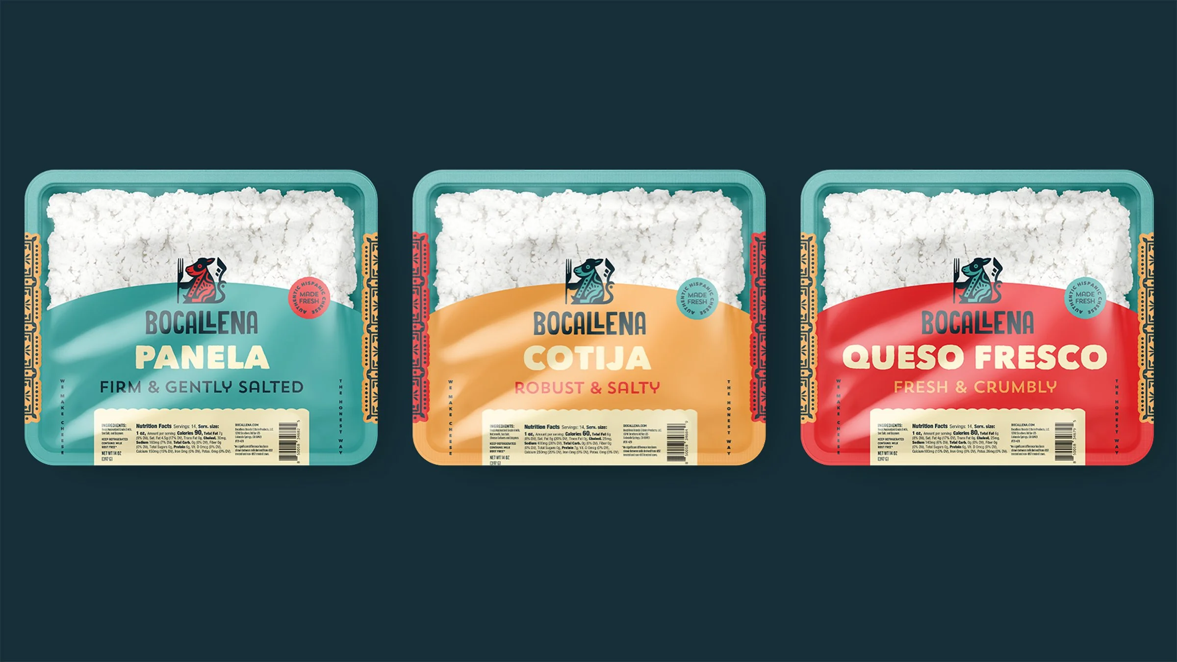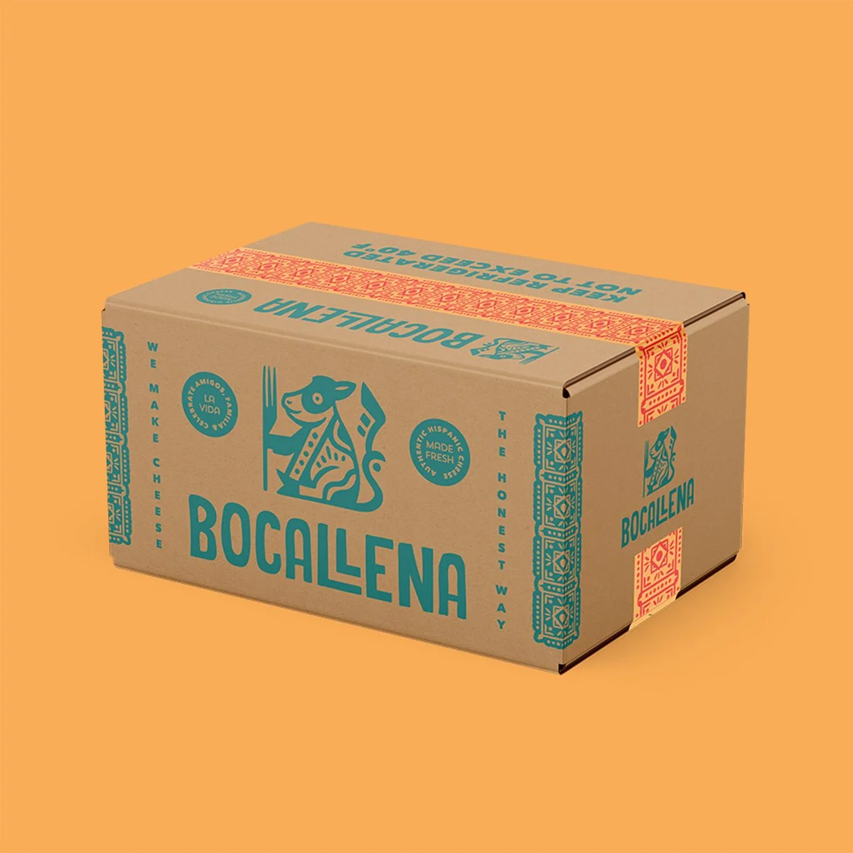 “The name Bocallena is an informal combination of the words mouth and full in the Spanish language. Combining them creates a unique, ownable name that speaks to the indulgent quality of their cheese. The colors and typography are inspired by traditional Mexican rotulos, or hand painted advertising signs typically found on the side of buildings and markets. The pattern is a modern take on talavera or Mexican tile work and the logo is created in a style reminiscent of the way animals are depicted in Aztec glyphs and Alebrijes . The idea was to take traditional art and culture and bring it to a modern place in the dairy space.”